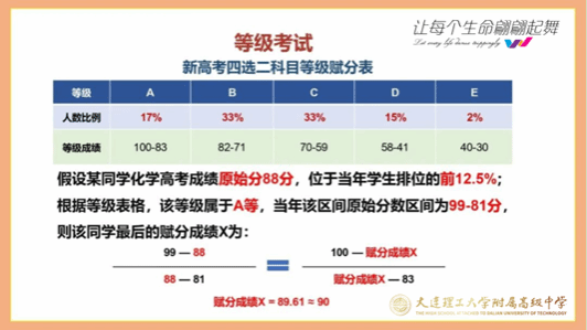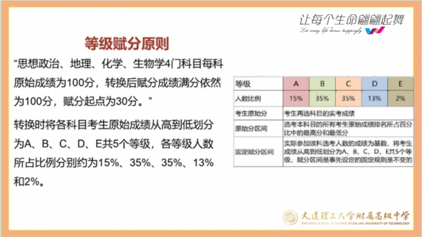 马校长援引实例,现场解读新高考的相关政策,从“3+1+2”模式“各科分值”“为什么物理和历史按原始成绩计入考生总成绩”“为什么思想政治、地理、化学、生物学考试成绩要实行等级赋分”“影响赋分的原则”方面详细介绍了我省现在运行的新高考政策。