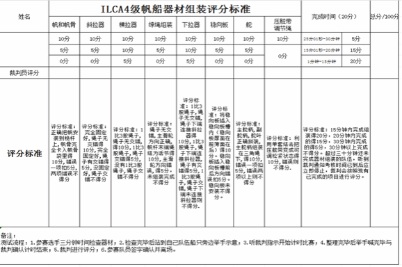 若因天气原因导致无法按时进行专项技术测试时,将顺延一天进行考试。若顺延一天仍不具备考试所需气象条件,则该专项技术测试改为组装船只测试。考核标准如下:(中国航海运动学校ILCA4级帆船器材组装评分标准)