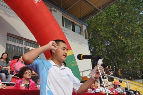 入场式结束,王跃进校长致开幕词。校长以“团结、文明、自信、和谐”为主题,阐述了本次运动会的实质意义,并希望每位运动员精神饱满,斗志昂扬,拼出成绩,赛出风格!随后裁判员代表白梓煜老师、运动员代表先后进行庄重的宣誓。最后,由校长助理石磊老师郑重宣布运动会正式开始。