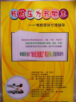 为了缓解阶段测试后部分学生彷徨、缺乏学习的激情、缺少学习的能量等现状,2014年11月13日第九节课,校心理咨询室在校羽毛球馆组织策划了一次针对高一高二年级的“我的压力我做主”团体辅导活动。此次活动得到了政教处、教务处、团委的大力支持。