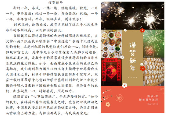 从欢庆祥和的剪纸、贴福到喜气临门贴春联,从阖家团圆的年夜饭到保佑平安的压岁钱……团圆、喜庆、祝福始终是“过年”不变的精神意蕴和文化内核。牛年“犇”来,丰富多彩的“春节”民俗文化正在大工附高学子中传承,迸发蓬勃力量,焕发时代光彩。