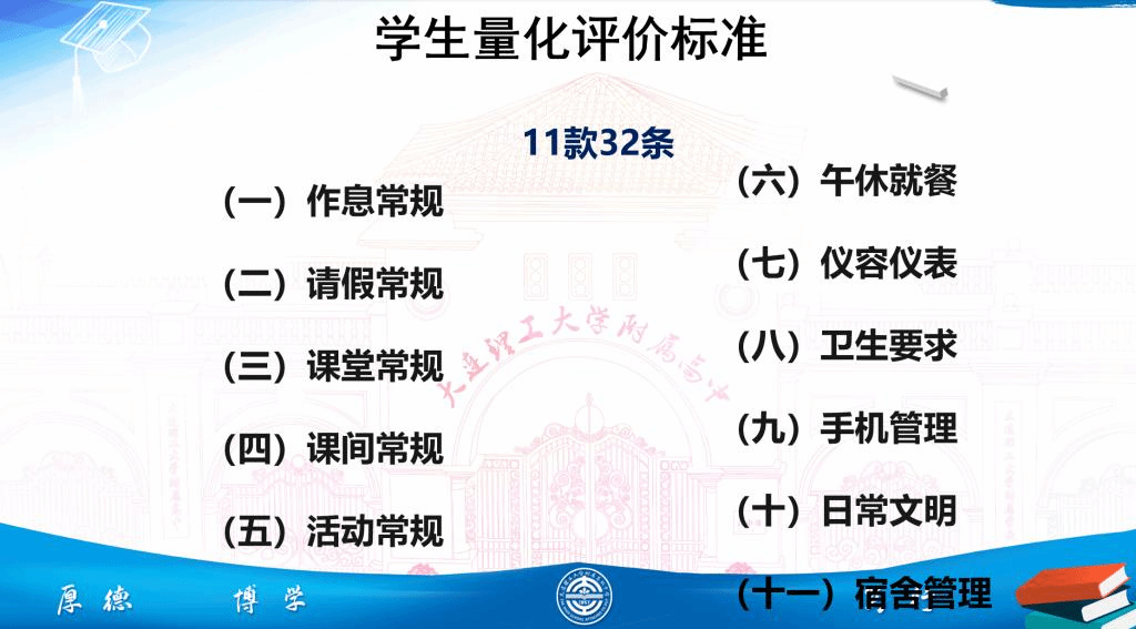 之后,德育处李满主任给同学们介绍了学校德育日常量化评价标准,就各项纪律和规范做出了精细的讲解,帮助学生通过自我管理、自我教育、自我约束,形成良好行为习惯、学习习惯和道德素养。“无以规矩不成方圆”,大工附高人要有钢铁般的纪律。