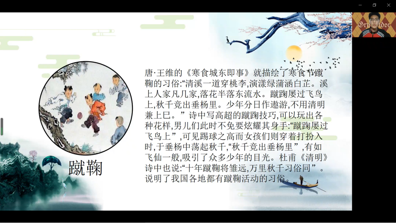 清明节历史悠久,自古以来,许多文人墨客都喜爱以诗歌来记述清明。如我们都熟悉的“清明时节雨纷纷,路上行人欲断魂。”这些诗歌,是我们瑰丽的宝藏,为清明添加了厚重的文学色彩。齐兴书与赵哲同学也准备了两首他们所喜爱的诗歌与同学们分享。