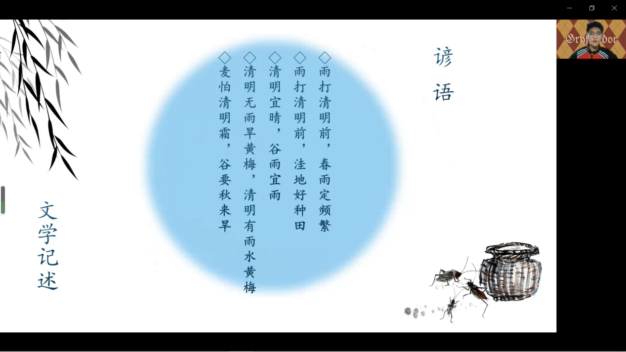 窗外又逢春,天地一清明。本次清明的班会我们述由来,讲习俗,赏诗文,怀先烈。清明节是春风吹满头,郊外少年游;亦是凭吊追远,以寄哀思。在这枯木逢春之际,我们就如着嫩叶芽,充满着希望与朝气。身为学生的我们或许不能像先烈一样抛头颅,洒热血,但也能脚踏实地拼搏奋斗,不负先烈,不负自我,不负家国!
