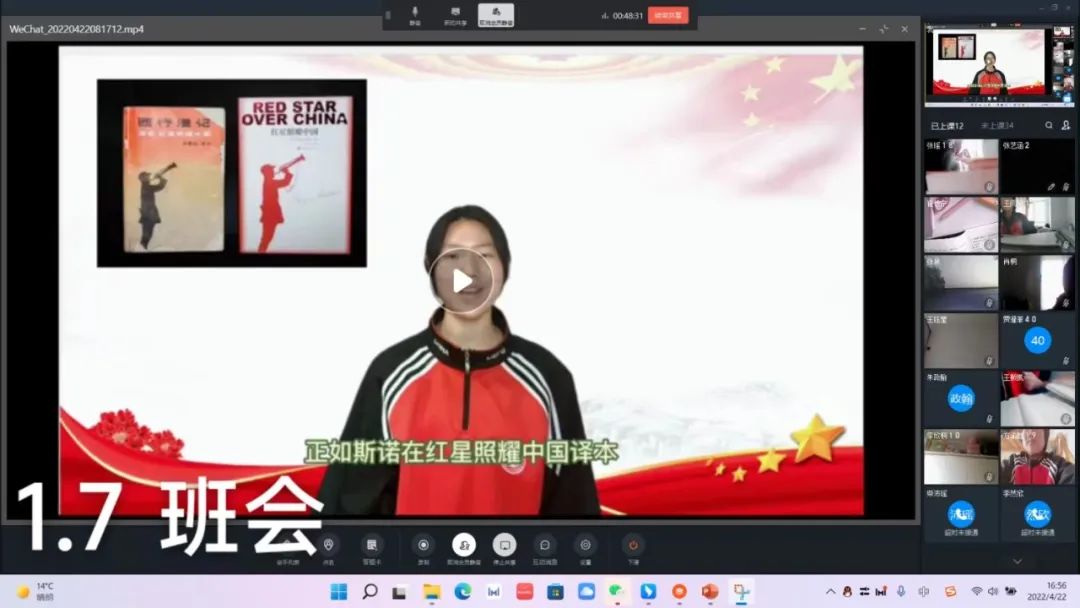 今日班会我看到了校宣讲团的精彩展示,对红色文化有了更加深刻的感悟,视频中详细展示了袁隆平院士、毛泽东同志的红星八角帽以及红星照耀中国等故事,历史故事增加了同学们的文化自信和民族自豪感。另外同学们对校宣讲团极其感兴趣,相信在不久之后一定会有更加优秀的新鲜血液加入到校宣讲团中。