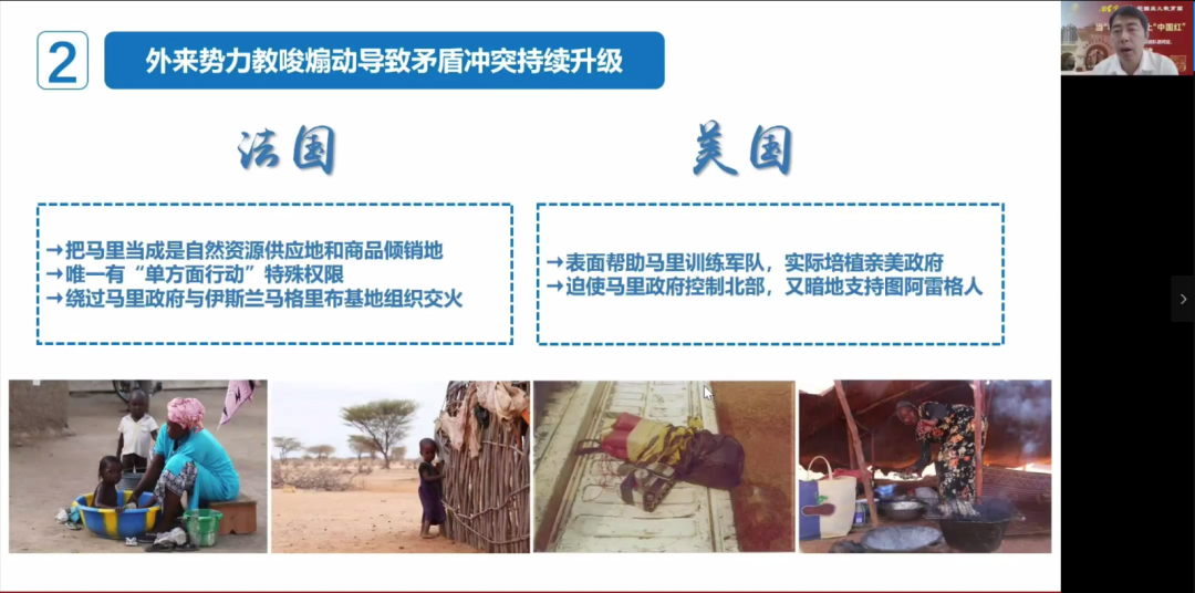 赵佳明老师原系中国第三批赴马里维和部队新闻官。在讲座中他分享了2015年作为中国维和部队的一名战地记者,前往马里共和国首都巴马科执行维和任务时的亲身经历。通过他所展示的一张张生动写实的照片,同学们感受到和平背后有战士们的汗水、泪水和鲜血,和平的背后更有我们有强大的祖国。