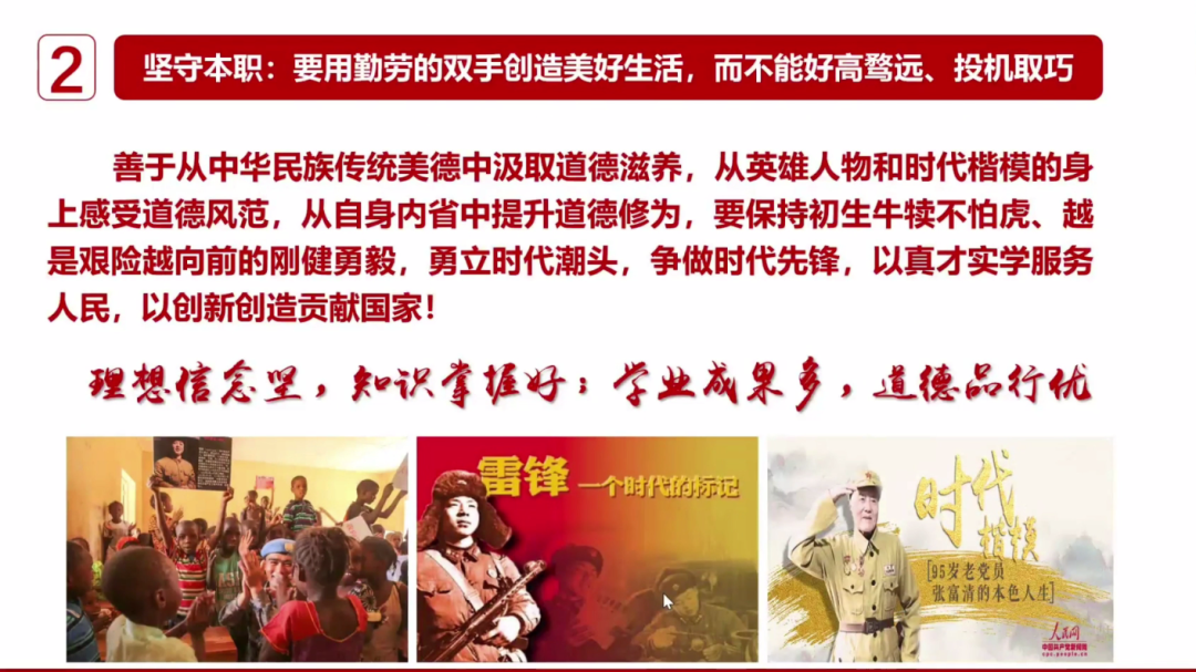 “中国无战事、军人有牺牲”体现了中国维和军人的爱国、责任、荣誉、担当,展示了中国军人守卫世界和平、视死如归的本色。赵佳明老师以“你所站立的地方,就是你的中国;你怎样,中国便怎样;你是什么,中国便是什么;你有光明,中国便不再黑暗”作为结尾,勉励同学们珍惜伟大祖国美好安定的生活,作为新时代青年学生,应当志存高远、忠于祖国,努力做新时代具有远大理想和坚定信念的爱国者。