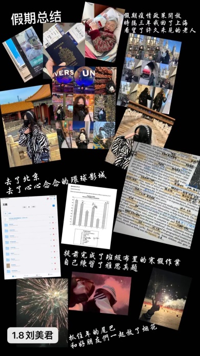 世界上最快而又最慢,最长而又最短,最平凡而又最珍贵的就是时间。转眼间我们的寒假已经进入了结尾,虽然我们的这个假期开始的比较仓促,但是随着疫情的结束,同学们也对自己的假期进行了充分的安排,比如重新安排因为疫情所耽误的旅行,见见许久未见的亲人朋友,或者培养自己的爱好……这个假期同学们充实着自己生活的同时,不断丰富着自己的知识,从身体到心理上都是一次很好的放松,与家人们迎接了新学期的到来,接下来便是同学们的自我总结。
