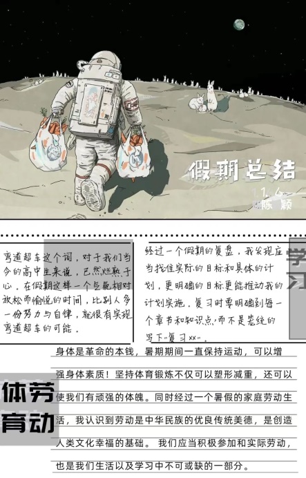 时光匆匆,所以我们才要加倍努力。看到同学们的假期总结,再一次感叹同学们的假期如此的丰富,不仅仅局限于一种形式,在不落下学业的同时,还去了自己喜欢的地方旅行,培养了自己的兴趣爱好,调整好了自己的心态,为开学之际做好准备,即使我们马上又将步入紧张忙碌的学习生活中,但是我们已经充满了能量,也准备好迎接新的挑战。开学考,合格考…陆陆续续的大考小考即将铺满我们的校园生活。希望亲爱的同学们能够在假期最后的几天里,继续加油,为新学期做好准备!最后一句话希望大家共勉“少壮不努力,老大徒伤悲”!