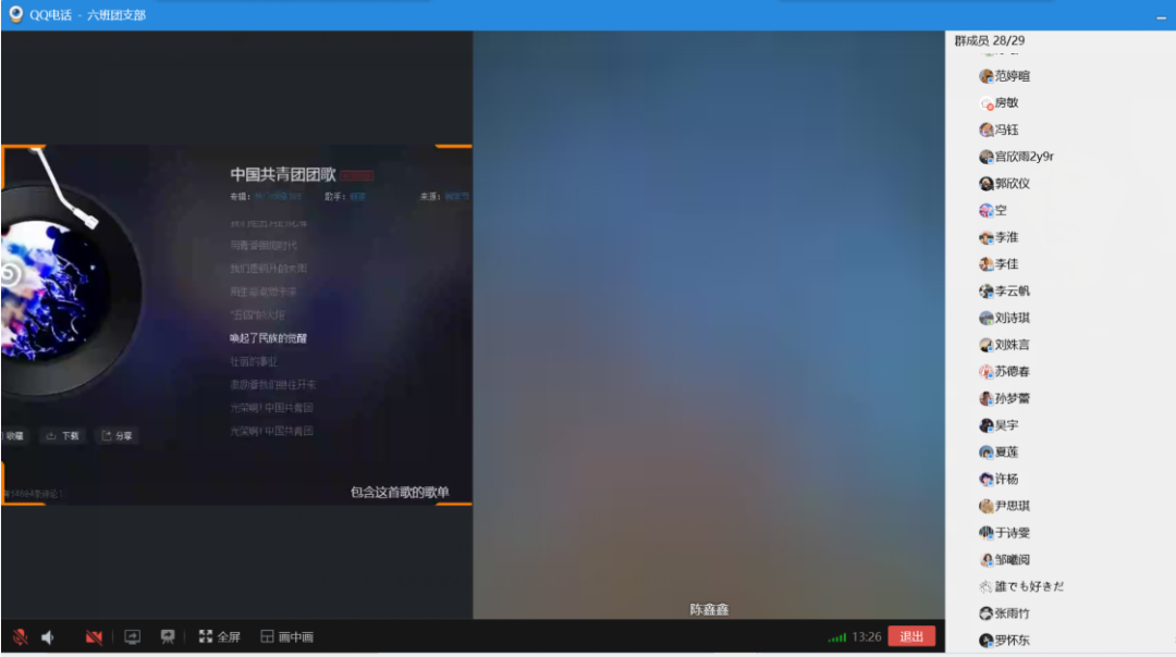 在这样一个特殊的时期,我校各个团支部采取“云入团”的方式,完成各支部新发展团员的入团仪式,同时在这样艰难的时期,带领老团员重温入团誓词。各班团员代表与班级同学分享新冠肺炎疫情期间涌现的先进青年典型事件,鼓励我校团员同学能够起到榜样作用,在疫情困难时期,起到先锋模范的带头作用。