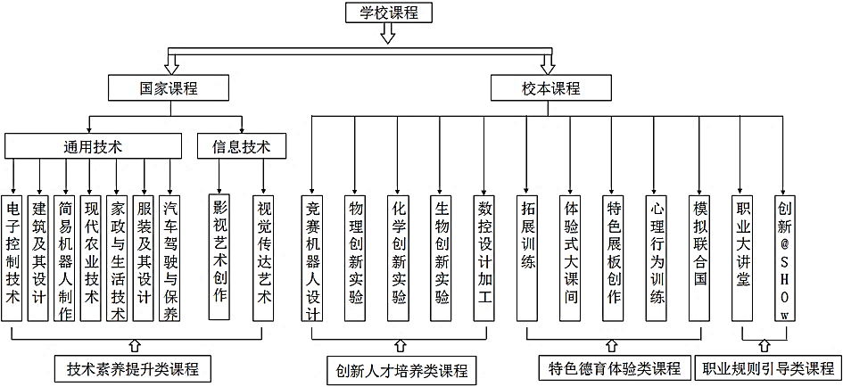 创新实践学校课程体系由技术素养提升类、创新人才培养类、特色德育体验类、职业规划引导类四大门类21个科目构成。按《课程方案》规定的科目设置,分为国家课程和校本课程,国家课程由通用技术和信息技术两个科目构成,按2017版《课程方案》,含上述两科的选择性必修和选修的部分内容;校本课程为创新实践学校的特色课程。按科目开设时间的不同,分为学生必修的课程和学生选修的课程,必修课程时间安排在高二学年中进行,市内各公办高中每年按教育局通知的时间参加活动,我校大都在每学年的下学期中旬进行,按《运行方案》规定,有13门必修课可供选择,完成16学时,获2学分;选修课程安排在每年的寒暑假期间进行,所有在校高中生均可自愿参加。按科目开设对象的不同分类,分为面向全体学生的课程和面向特长学生的课程。按参与者数量的不同分类,分为小组合作完成的课程和班集体或全校共同完成的课程。